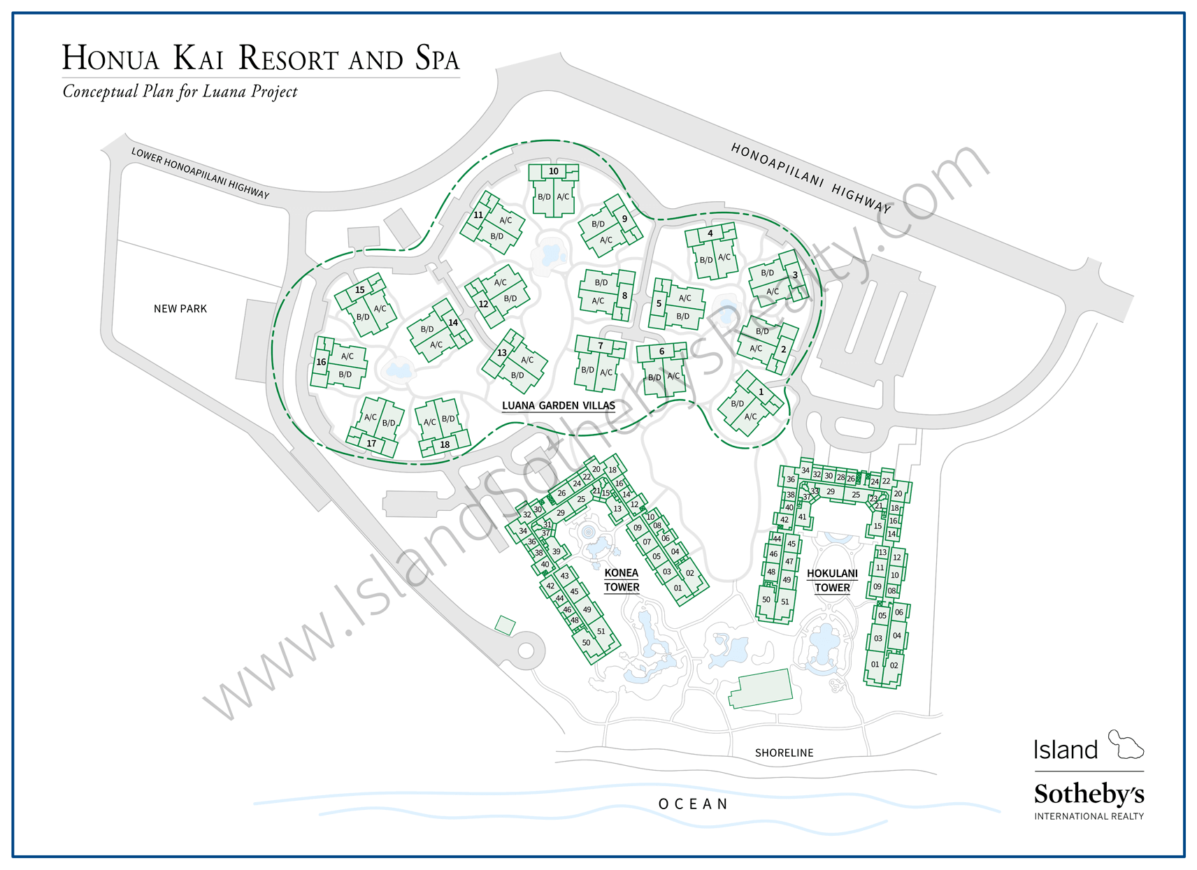 Honua Kai was designed with a 150-foot setback area from the shoreline and has a sandy beach in front. There is a boardwalk path meandering along the beach with multiple raised walkways across the coastal dues to the sandy shoreline.